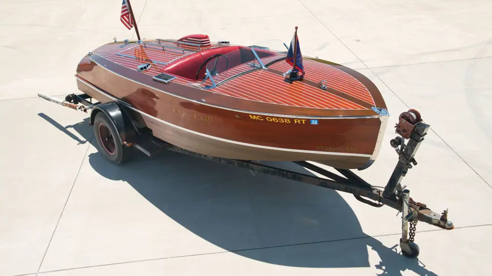 This exquisite Chris-Craft wooden boat displays the high-level of craftsmanship that the manufacturer is renowned for. The single cockpit, barrel-backed beauty is powered by a Chris-Craft Model KB inline six-cylinder marine engine that is set up with three side-draft carburetors. The detail in the wood deck is always discussed when one is taking in the beauty of one of this eras boats, as well as the exceptional brightwork trim elements that are in abundance. The blue and white instruments have the perfect nautical color theme and the red seat cushions complete a period elegance. The boat is offered with the appropriate trailer.