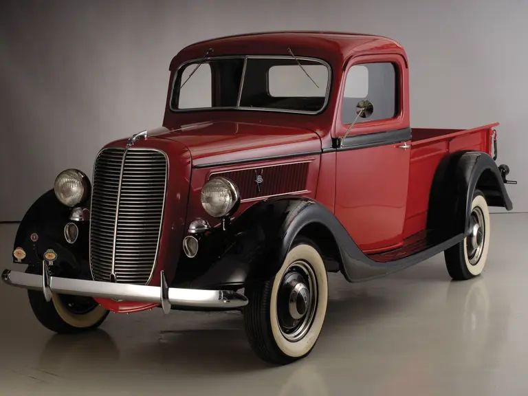 Formerly part of the renowned Michael Dingman Ford collection until 2006, this 1937 Ford Pickup continues to benefit from a high quality, show-winning body-off-frame restoration. Handsomely finished in red with black fenders and black hood and cab accents, it began life as a Standard model powered by the V-8-60 engine but was restored with an 85-horsepower, 221 cubic inch V-8 and Deluxe trim.
