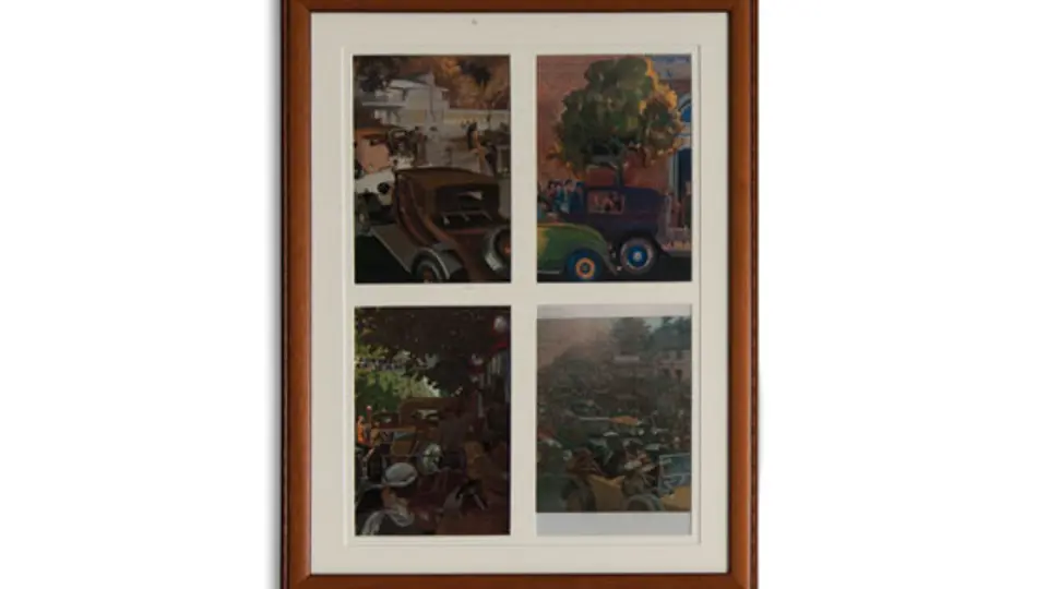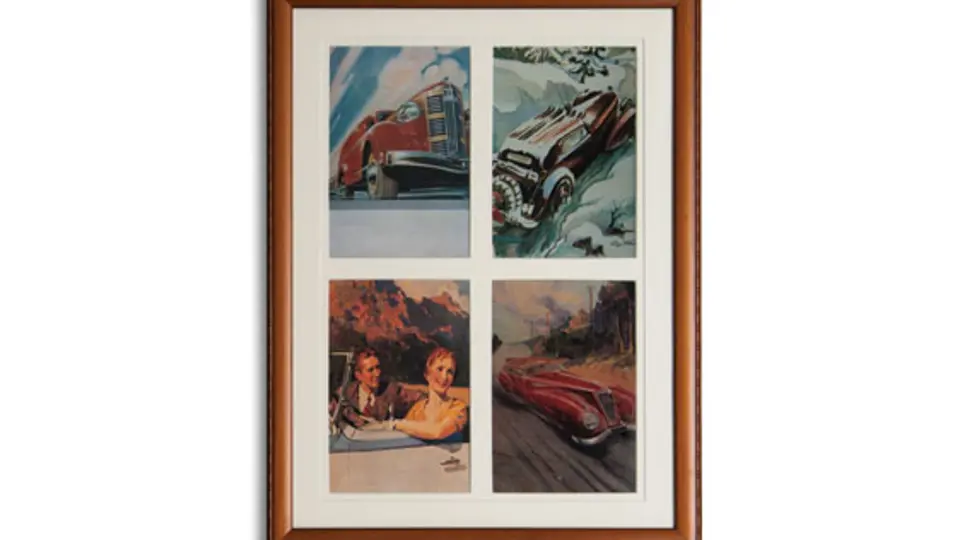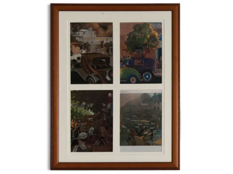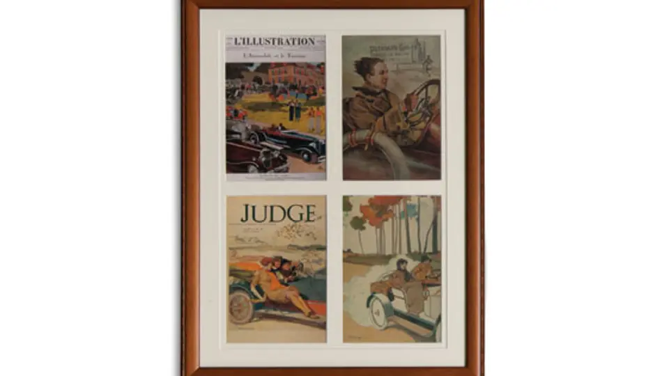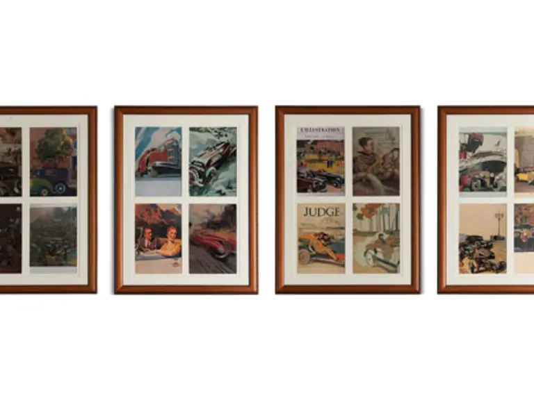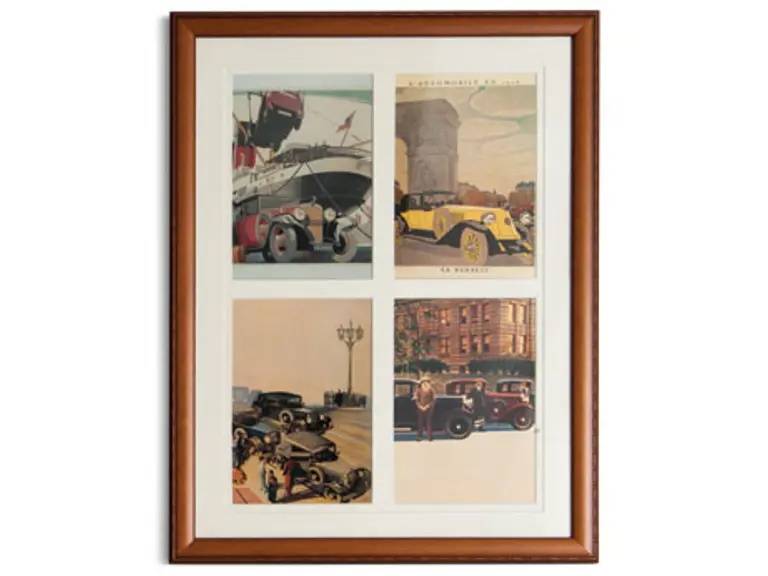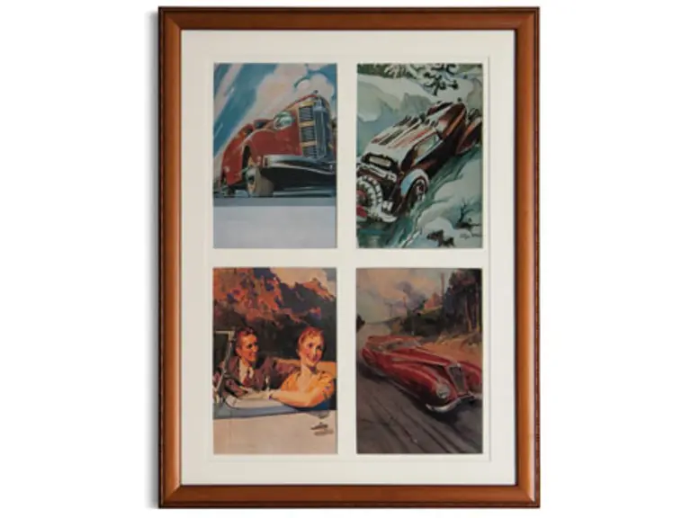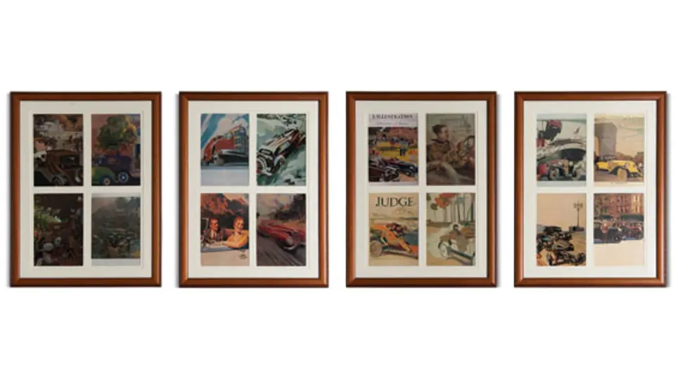 Grouping of four Framed Vintage Automotive Scenes with four images per frame. Collection of 16 framed magazine covers & illustrations of the 1920’s & 1930’s by various artists. Each of the 4 renderings is in a matching frame.