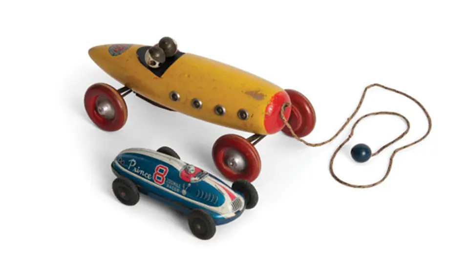 “Ted-lers Inc.” pull toy. Also a tin race car, friction powered. "Prince H8 200 mi. Racer"