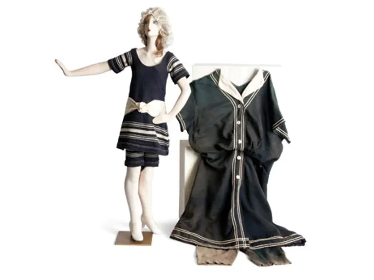 Contemporary Mannequin featuring 1920’s style children’s bathing costume, and a very early wool adult bathing costume circa 1920. Sun fading to front side of adult bathing outfit.