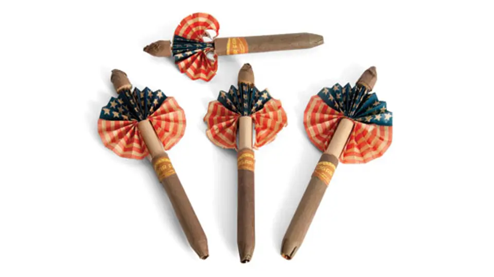 Four early, colorful Exploding cigars, with bursting American Flag colors.