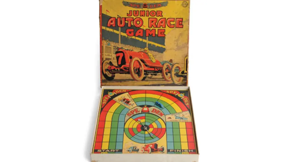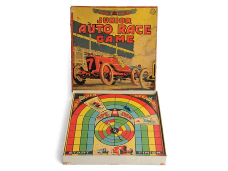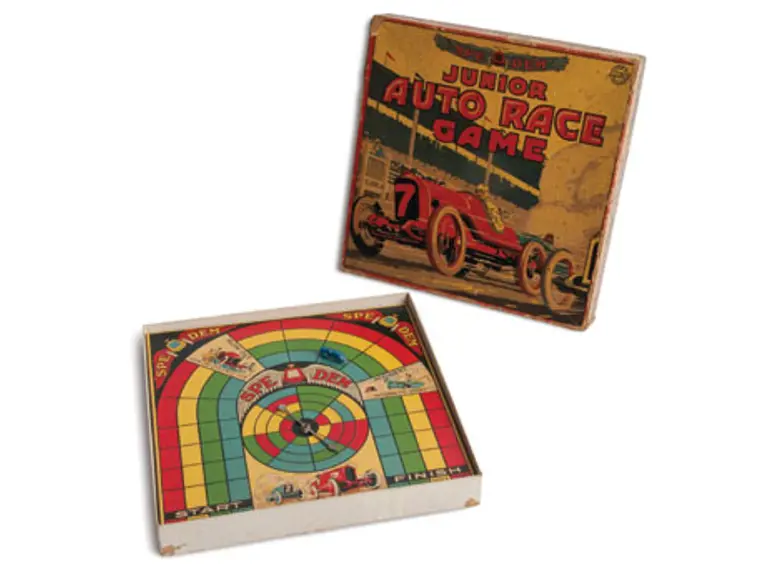 Colorful auto racing board game from 1927, this game from the Alderman Fairchild company comes in its original box. Missing Three of Four miniature gameplay cars.