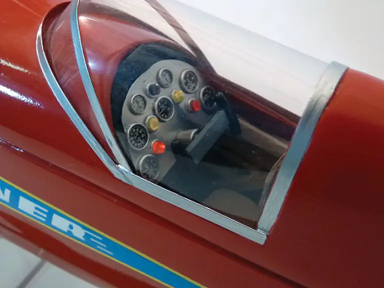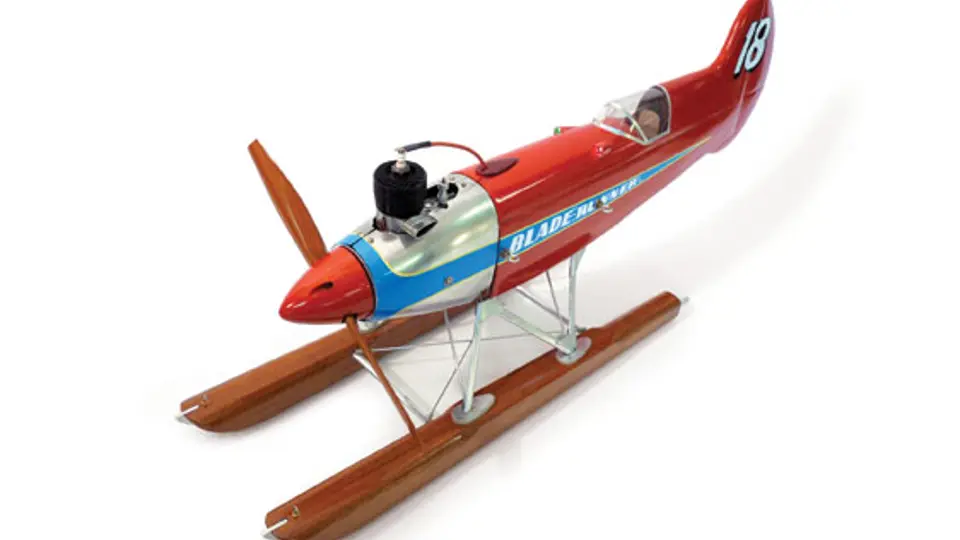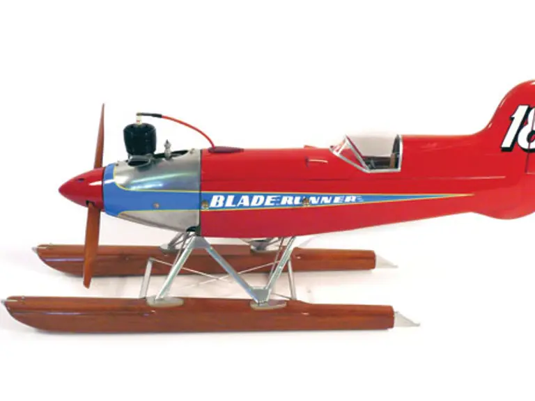"Blade Runner" A one off! Entirely hand built over a period of two years, this fantastic whimsical ice racer was built by master model maker Alan Hill. The fuselage was painstakingly built up in the proper woods around the air frame ribbing. It is patterned after Victor Stanzel's great design of the "Super V Shark." The power is a rare 1940, one year only, spark ignition Ohlsson & Rice .60 "Custom" gas engine. The running gear is complete and the racer is ready to tear up the ice. The running lights and the lamps on the detailed dash are functional. Impressive at 28 inches in overall length and riding on 19 inch shrouded blades. This is Alan Hill's final effort and by far his grandest. Simply the best!