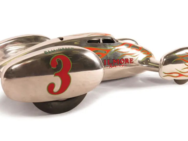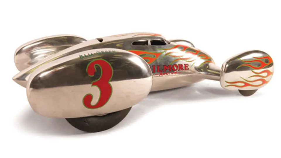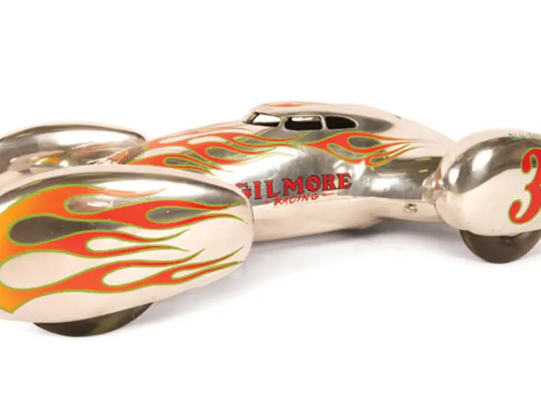 "Based on the Dooling Brothers 1939 cabin streamliner, nicknamed “The Frog,” first the late Randy Giovenale, then Farrell Bird took the Dooling design straight off the planet! This masterpiece carries fully enclosed cast aluminum aerodynamic wheel houses on all four wheels! Past that the front wheels have full independent suspension!! The “cabin” portion is chopped with “gun slit” windows added. The “Gilmore Oil” lion, graphics, and the incredible flame work was painstakingly hand enameled by Mike Maher. An unrepeatable opportunity. "