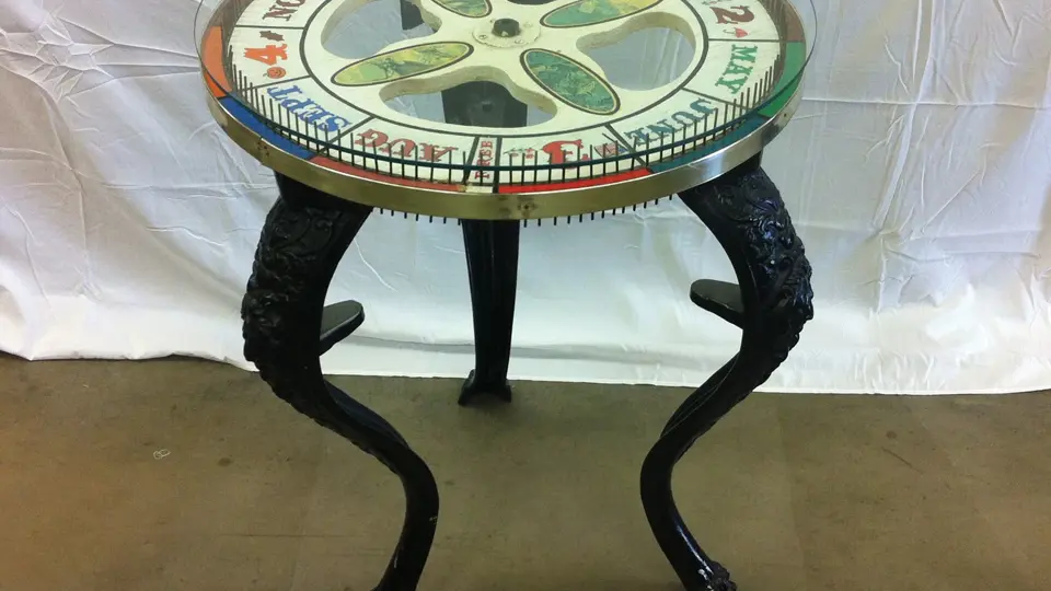 Vintage Gambling/Gaming Wheel Conversation Table-measures 31" H x 24" D-three (3) ornate cast iron legs embelished w/lions-months of year on the gaming wheel-has a thick tempered glass top-very cool and unique collector's piece