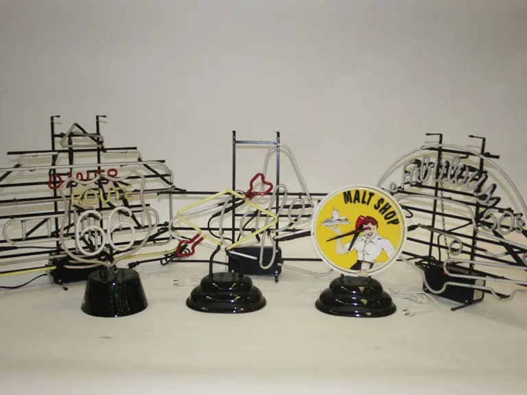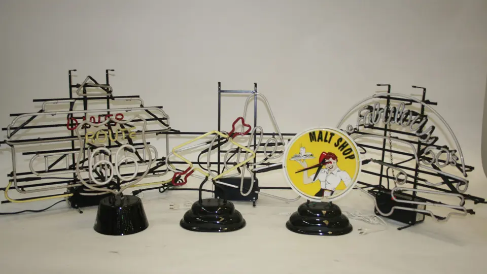 Lot includes 6 reproduction, diner-themed neon signs. "Malt Shop" clock neon, "Route 66", "Diner", "The Fabulous 50's", "Café", and "Sunoco". Please note that the "Café" and "Sunoco" neon's will need repaired. Others are in working order.