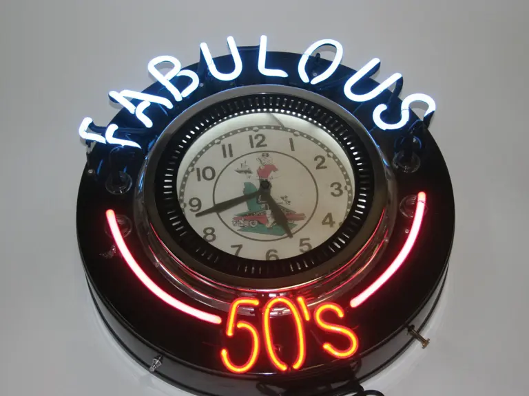 This "Fabulous 50's" neon clock, 21" in diameter, is an original with working neon, but will need some repair before able to be hung.