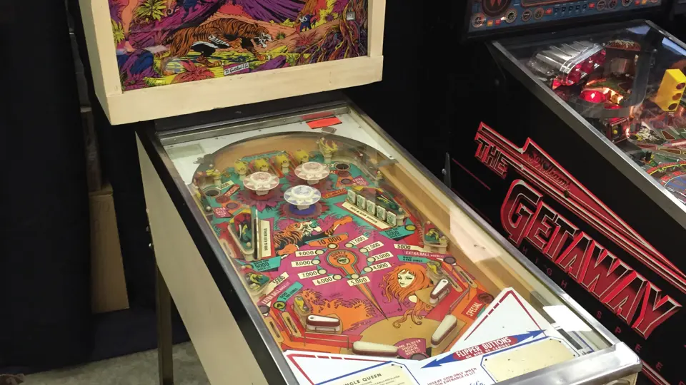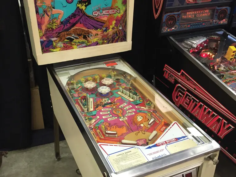 Gottlieb Jungle Queen can be fully illuminated and scores to 199,000 with three pop bumpers, two kickout holes, two banks of 5 drop targets, two 3" flippers, and two 2" flippers. Nice vintage colors and graphics.