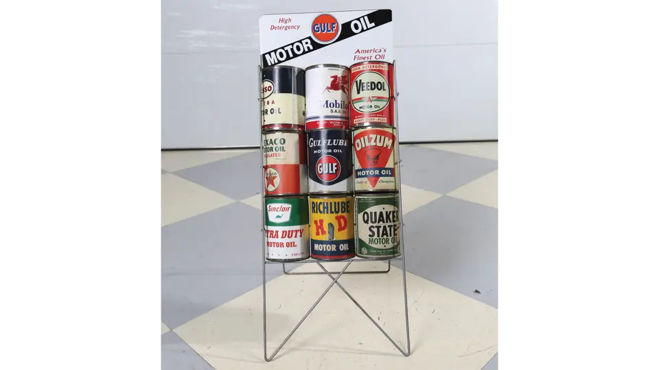 Service Station Wire Rack With Tin Sign Includes 9 Different Cans