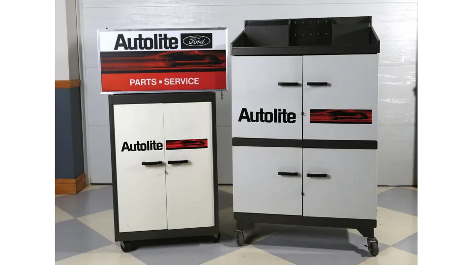 A Plastic Faced Illuminated Sign And Two Storage Cabinets