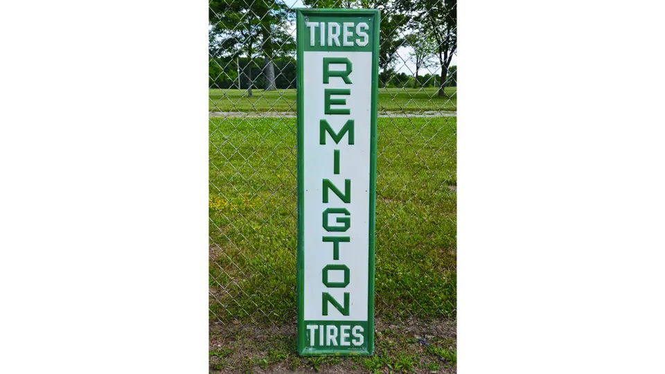 Remington Tires sign, 1968. Single-sided, tin painted, with embossed letters, good overall. Condition 7 to 7.5