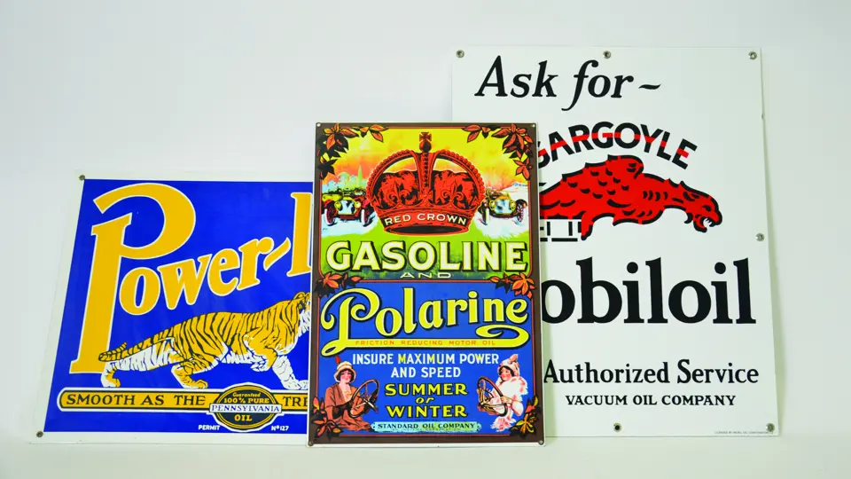 Featuring Redcrown Polarine, Power Lube Motor oil, and a gargoyle Mobiloil. All porcelain enamel and in good condition.