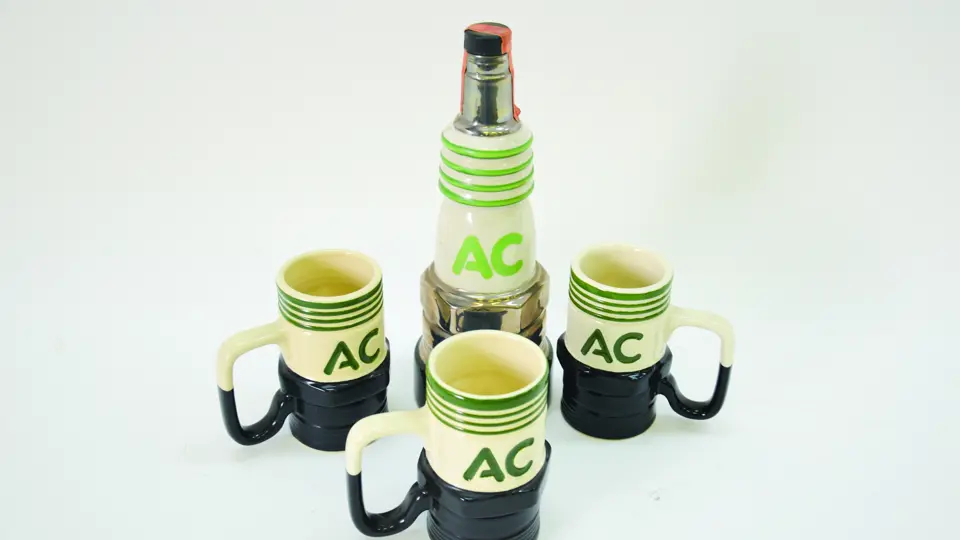 And AC spark plug ceramics grouping lot features three mugs and a spark plug to Cantor