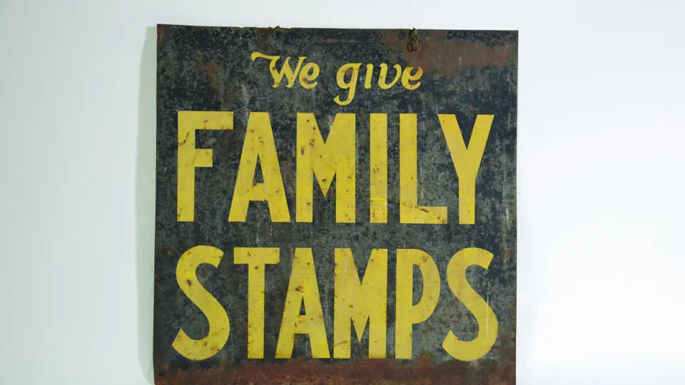 A double-sided, tin painted ‘Family Stamp’ sign.