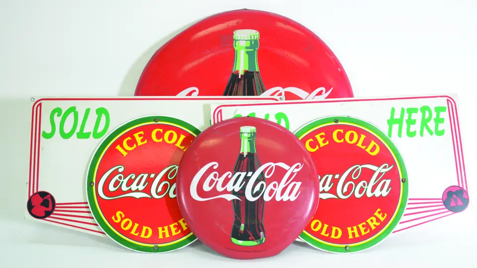 Featuring 2 button signs and 2 “ice cold sold here” Coca-Cola signs.