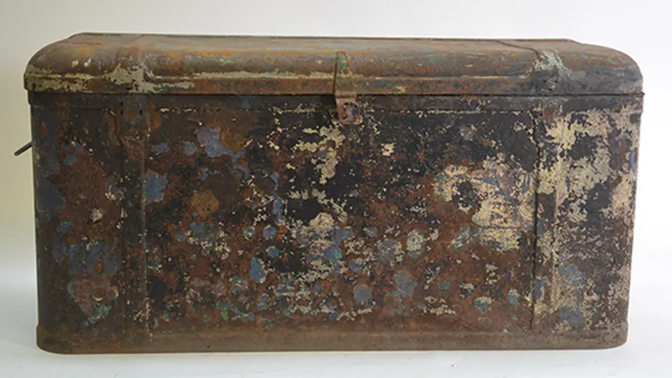 A rustic pressed steel carriage trunk.