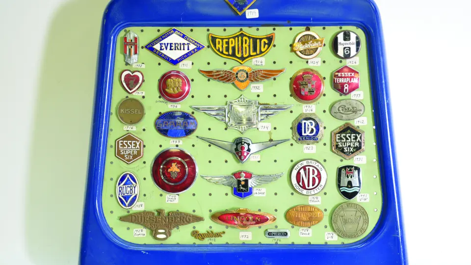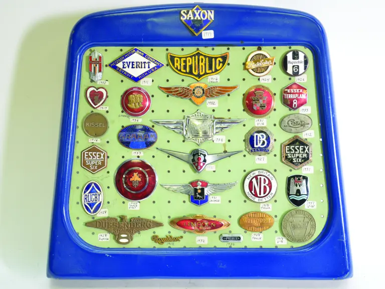 A collection of various automobile badges. Collection includes: 1933 Hupmobile, 1911 Everett, 1916 Republic Truck, 1924 Studebaker, 1926 Hupmobile 6, 1917 Crow Elkhart, 1936 Graham, 1932 Dodge Brothers, 1931 Cadillac V-16, 1933 Essex Terraplane 8, 1916 Kissel, 1933 Graham, 1934 Buick, 1927 Dodge Brothers Senior, 1912 Cole, 1934 Essex Super 6, 1940 Packard Super 8, 1931 LaSalle, 1918 New Britain Truck, 1951 Volkswagen, 1928 Duesenberg replica, 1912 Rambler, 1932 Lincoln, 1936 Pierce Arrow, 1928 Whippet 6 Truck, 1918 Standard Steel Car Company, and others.