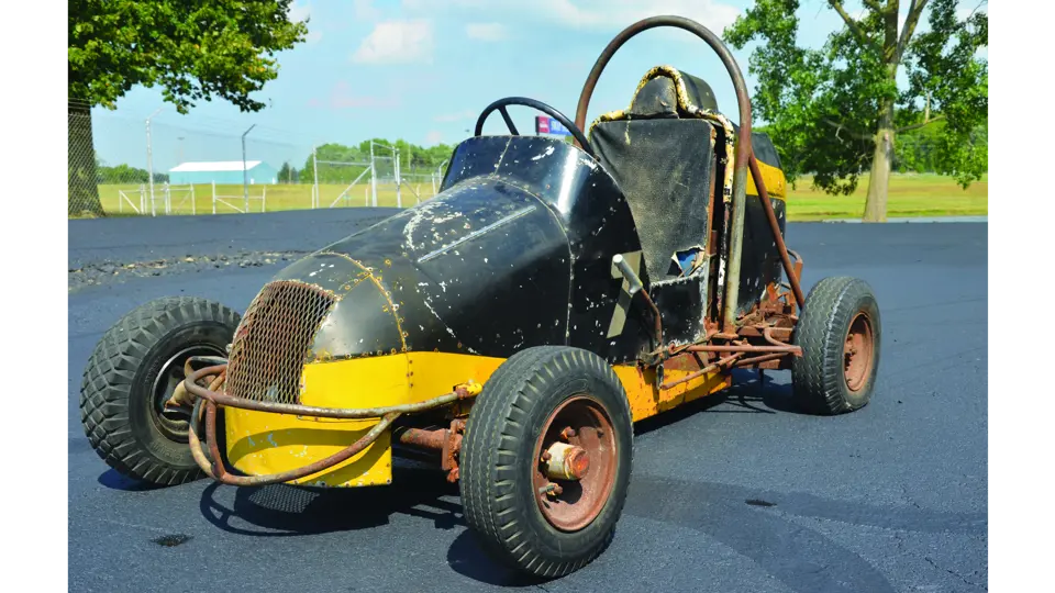 This car uses a scratch-built single seat chassis with a 1 or 2 cylinder mid-engine, rear drive layout and all-encompassing roll cage. All aluminum body finished in black and yellow.