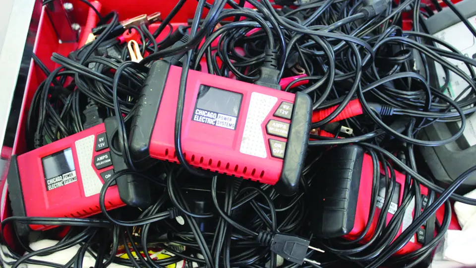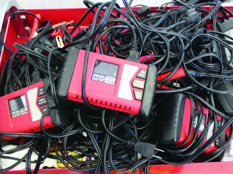 A grouping of trickle chargers and car batterey jump boxes