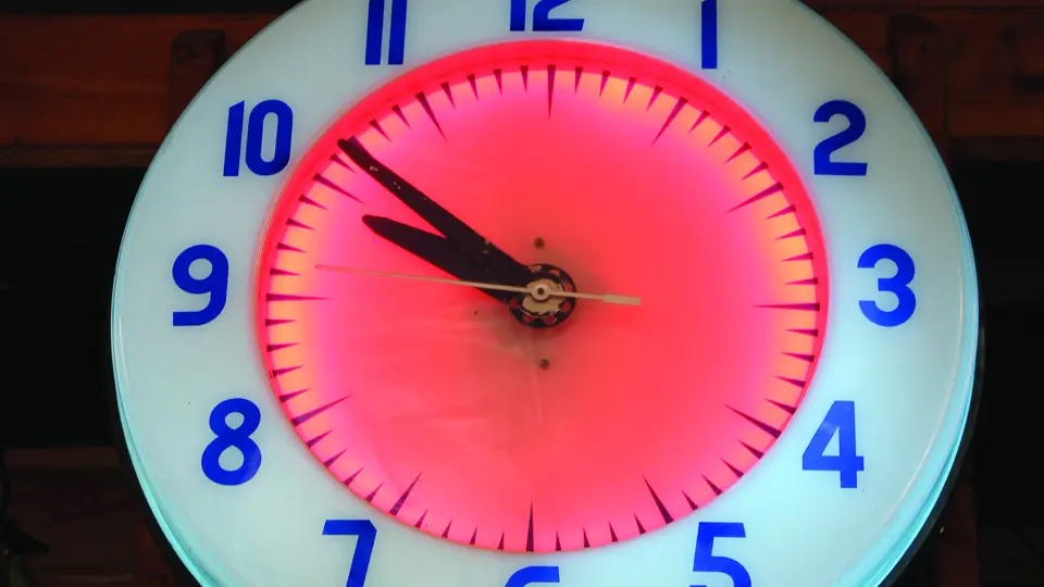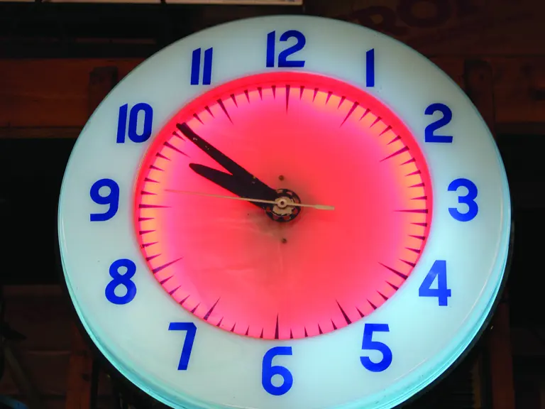 A large, illuminated clock
