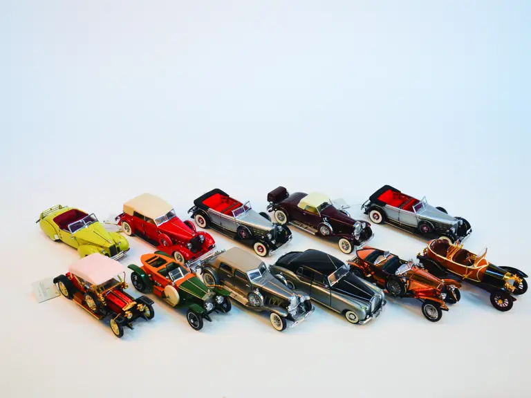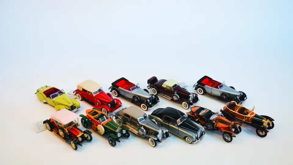 Lot features ; 1910 Rolls-Royce Balloon Roadster, 1934 Packard convertible sedan, 1933 Duesenberg 20 grand, 1921 Rolls-Royce Silver ghost, 1934 Packard LE 4 door, silver convertible, 1935 Duesenberg J550, 1934 Packard LE four-door silver convertible, 1911 Mercedes-Benz wood body, 1940 Packard Darin 2000 DC four. All come in original boxes