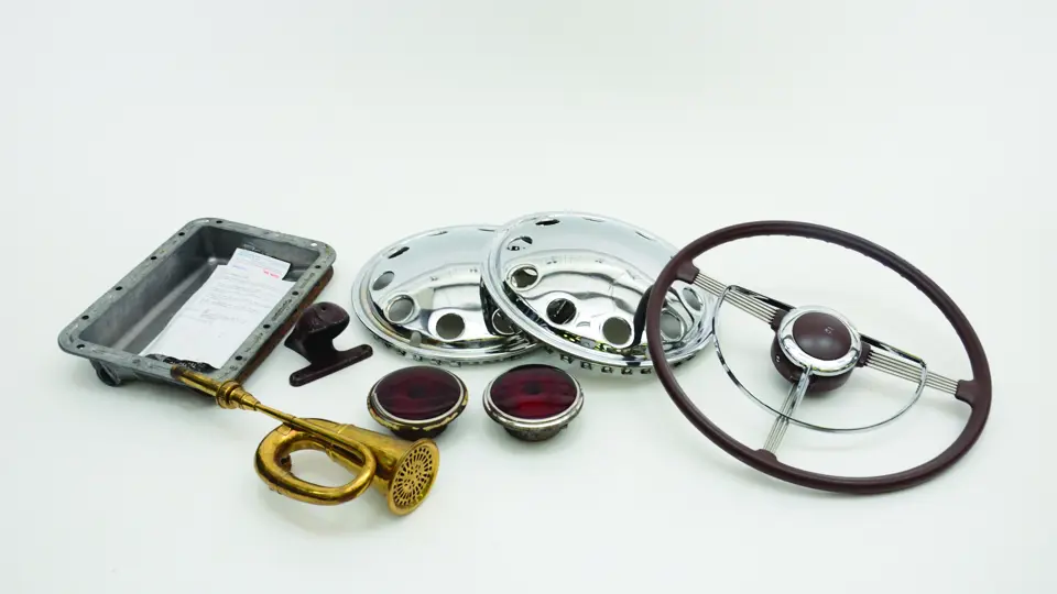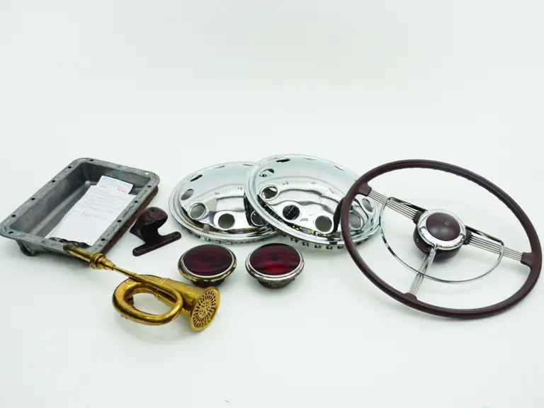 A selection of Cord Phaeton spares together with a Corvair oil pan and brass horn