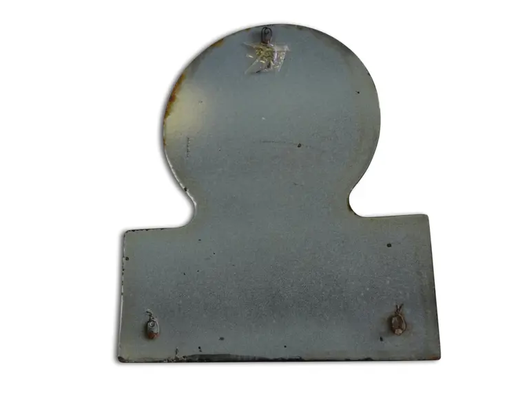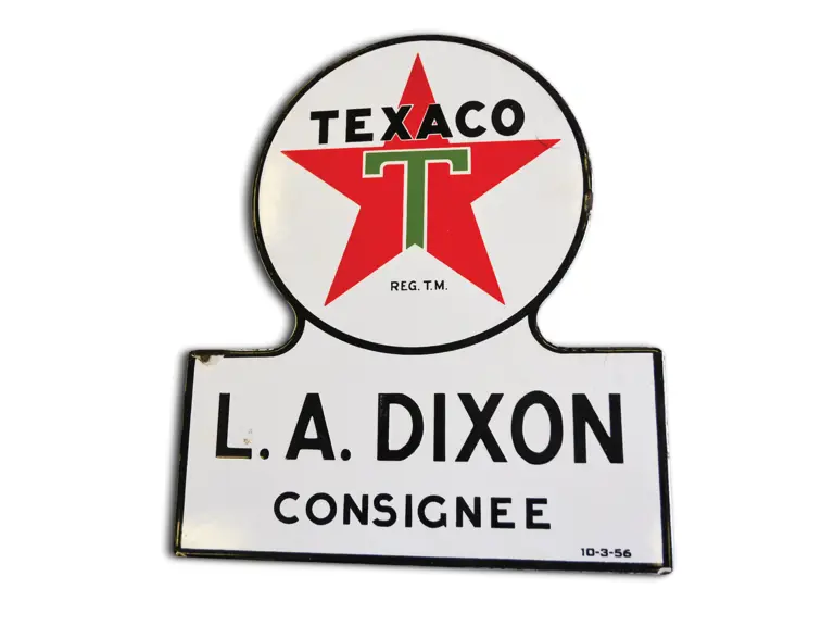 This sign has good color and gloss with small chips around the perimeter. Dated 1956.