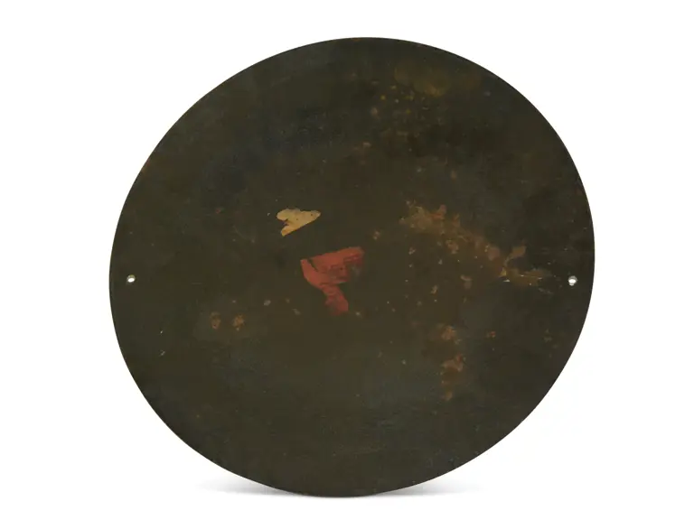 has excellent gloss and color, one tiny chip in the field and around the perimeter, looks to have some of the original paper label on back