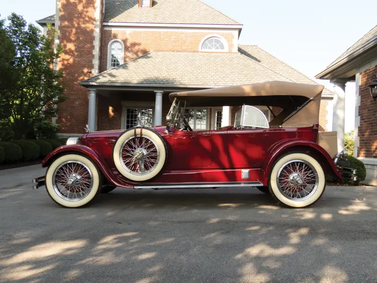 The Model A was powered by a straight-eight of 260 cu. in. that was developed with a single overhead camshaft actuating two valves per cylinder, which was a result of the Duesenberg’s experience winning at Indianapolis. Producing 88 hp, it was mounted on a ladder-style chassis frame of rather conventional design and had a three-speed sliding-gear transmission and four-wheel hydraulic brakes, the latter of which was the Model A’s real innovation—it was one of the first American automobiles to be so equipped. The Model A was swift and road-able—as close as any 1920s automobile ever came to being a “driver’s car.”