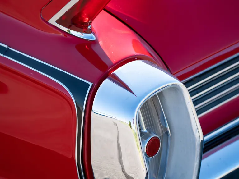 By the Eldorado’s fifth generation, introduced for 1961, the flamboyant fins of the 1950s had—under the guidance of GM styling head Bill Mitchell—evolved into sleek Jet Age blades. Brightwork still abounded, however, with a full-width chrome grille (incorporating quad headlights) dominating the car’s front end; the grille’s horizontal emphasis carries over to the stylish mid-century dashboard. A 325 horsepower, 390 cubic-inch V-8 mated to a four-speed Hydra-Matic automatic transmission provided ample motivation for this long, low, and wide convertible.