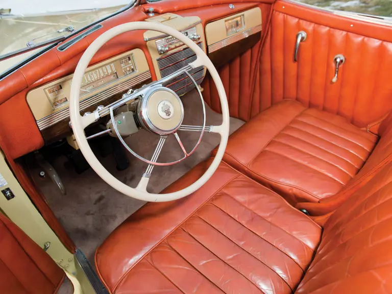 “Packard Darrins,” as they were known, had become a favorite of celebrities who appreciated Packard’s engineering but wanted something a bit more lightheartedly Californian. They featured the so-called Darrin “dip” in the doors and a vee’d windshield, which were both signatures of the designer. Aircraft-style padding wrapped around the dashboard and interior, and bucket seats were provided for the driver and front passenger—a very sporty touch for the late 1930s.