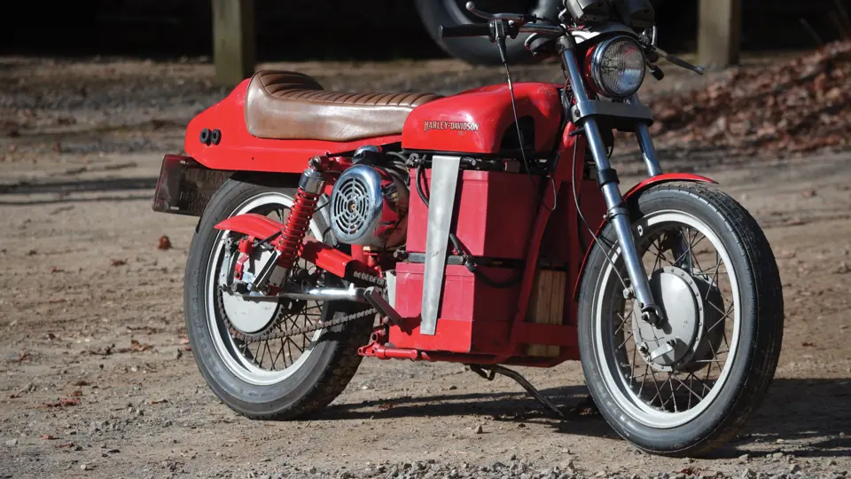The 1978 Transitron Mk II Electric Prototype presented here is a one-of-a-kind machine that was built in Honolulu, Hawaii, by the Transitron Electric Corporation. Designers utilized the chassis from a 1971 Harley-Davidson XLH Sportster and reengineered the entire drivetrain by replacing the 900-cubic centimeter OHV internal combustion engine with a variable-speed electric motor and a series of deep-cycle batteries. Power is put to the rear wheel through an automatic four-speed transmission with chain-drive. Use of a proprietary control system with an integrated circuit mini-controller allows the machine to accelerate from 0–30 mph in 5–6 seconds. The machine’s instrument panel is mounted to the handlebars, which features an electric speedometer, a tachometer, and dual ammeters.