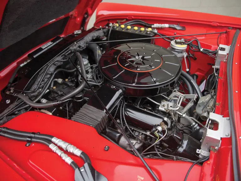 The beauty offered here has been enjoyed for several years by noted collectors Richard and Linda Kughn at their home in Florida. Finished in the beautiful factory-correct color of Cherokee Red, it has all of the luxuries expected of this model, including power everything—windows, top, and seats, with the seats themselves being thickly and comfortably upholstered in rich red leather. While the restoration is slightly older, it still presents beautifully, with good factory-standard shut lines and panel gaps and an engine bay properly finished with correct reproduced assembly line markings and detailing. The interior is particularly glamorous, with its engine-turned dashboard finish carrying Space Age–inspired gauges and a signal-seeking Town & Country radio. Mileage recorded is 88,713, which may well represent the mileage since new.