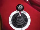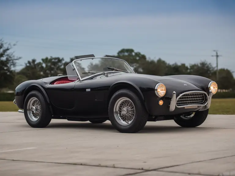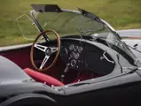 The car was finished in the stunning black-over-red leather with matching red Wilton wool carpeting and was fitted with its original grille and front and rear nerf bars. A Class A Cobra, it is also equipped with classic chrome wire wheels shod with Michelin X radials, sun visors, wind wings, its original top, a tonneau cover, side curtains, a proper grease gun, a jack, and a spare wheel in the trunk. Inside the immaculate interior, the driver faces correct Smiths gauges, a correct Rotunda tachometer, a rare original clock, and an original AC wood-rimmed steering wheel and optional heater.