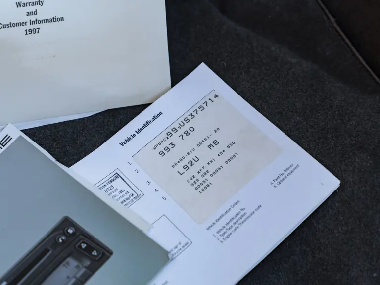 The low-mileage Arctic Silver over Boxster Red leather example offered here is undoubtedly one of the finest original Turbo S models currently available. Its striking paint and interior combination honors Porsche’s then-new mid-engine Boxster roadster. The 911 Turbo S came well equipped with gathered leather upholstery for the front and rear seats and extensive leather-covered details such as the door panels, center console, seat belt housings, and even many of its control switches. It features its correct 911 Turbo S-specific details such as its wheel center caps, yellow brake calipers, and carbon fiber interior trim pieces. This example’s only modifications from stock are a period aftermarket audio head unit and tasteful window tinting.