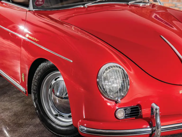 Offered here is a fine example of a numbers-matching 356 A 1600 Speedster, whose factory Kardex, a copy of which is included on file, informs that it was completed 9 May 1957. The 356 left the factory with sealed-beam headlamps—indicating that it was built for the US market—and finished in red with a black leatherette interior and cloth top, as it appears today. The car was also fitted with 356 coupe seats rather than the standard Speedster buckets. It is powered by a 70 bhp twin-carb, 1,582 cc air-cooled four-cylinder engine, no. 65352, with a four-speed manual transmission and drum brakes.