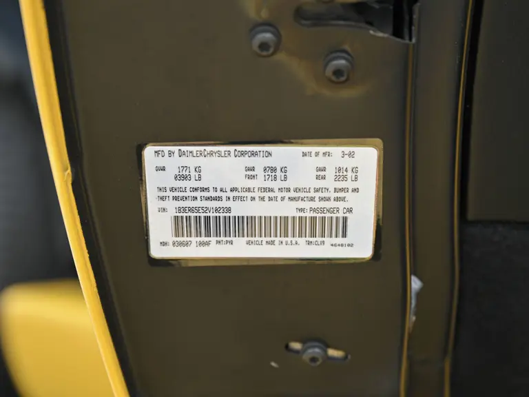 Viper production took place across five distinct generations; this 2002 Viper RT/10 convertible represents the final year of the model’s second, or SR II, generation. Launched in 1996, SR II cars largely retained the dramatic original styling overseen by Tom Gale, yet their 8.0-liter V-10s (still mated to a mandatory six-speed BorgWarner manual transmission) would grow in output to an impressive 450 horsepower. Chassis refinements, as well as airbags, were incorporated over time. The model remained true to its original philosophy, however, and it was fitted with only minimal electronic driver aids!