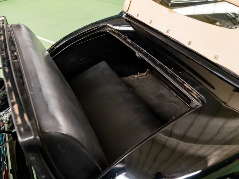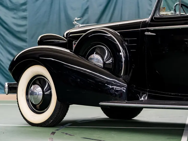 According to a factory build sheet on file, this 355-E was ordered by the John D. Wendell Cadillac dealership in Albany, New York, for display at the General Motors Spring Show staged in April 1935 at the Hotel Astor in New York City. Ordered just three days before the show began, the Cadillac was finished in black paint with a tan top, and optioned with a Goddess radiator mascot, side-mounted spare wheels, a wire-spoked “flexible” steering wheel, twin license plate frames, and black metal disc covers for the wire wheels. As suggested by inspection stickers that are still affixed to the windshield, the car remained in the New York area as late as 1988.