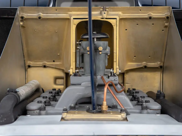 Alongside its scrupulous cosmetic restoration, the T77 benefitted from a total mechanical overhaul. Its air-cooled V-8 was rebuilt (with pistons, connecting rods, and valves replaced) and a new-old-stock carburetor was sourced from the Czech Republic. The car’s transaxle, as well as ancillary components including starting, braking systems, and electrical systems, were also refurbished at this time. Front suspension components were replicated where the original units were found to be beyond salvage, and its steel box frame was carefully repaired.
