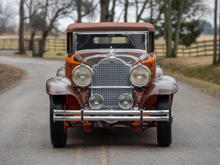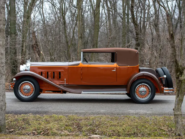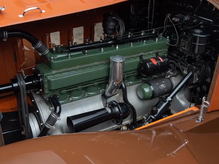 To author Fenster, Hill recalled that the car’s restoration was a magnificent challenge, as Proux began with a factory closed body and, essentially, reworked and changed every panel, much as Brunn would do with convertible sedan body shells for Packard cabriolets later in the 1930s. The level of fine detail extended to reshaping the doors, which were given curved “carriage sills” that drop in the center, easing entry and exit for the passengers. Fenster noted that Proux shaped new front and rear fenders, both with a pronounced beading edge, as well as a new cowl and hoodline. Typical of a coachbuilt body in this period, much of the hardware was custom-made by the shop itself, including the geared window lifts that fit grooves in the window frames, for truly smooth and seamless operation. Proux retained use of the striking 745 headlights and single taillight, with creases that subtly echo the design of the radiator shell.