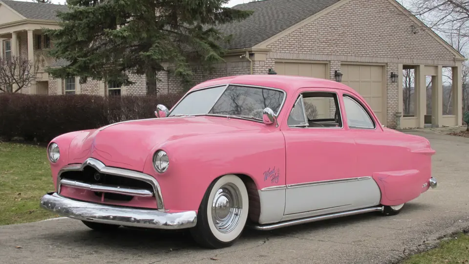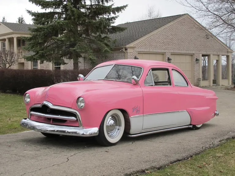 Equipped with a flathead V8 engine and a three-speed manual transmission this custom has been lowered and features shaved door handles, rear fender skirts, dual exhaust, custom pinstriping, dog dish hubcaps, and a power antenna.