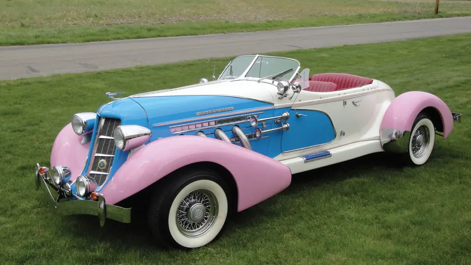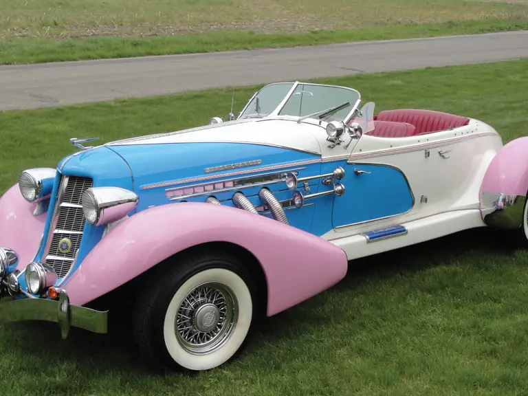This uncommon four-seat Speedster recreation is powered by a late-model V-8 engine connected to an automatic transmission. There is a hard cover for the rear seating area and the Auburn recreation comes equipped with leather interior, convertible top, modern sound system, full analog instrumentation; power steering and brakes. The striking paint scheme is complemented with wire wheels, wide whitewall tires, air horns, windshield wings, driving lights and spotlight. This is a factory built version versus kit construction.