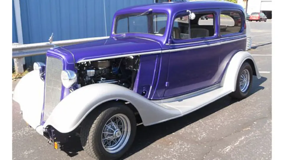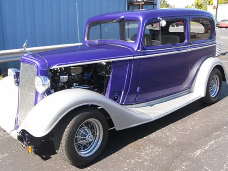 With a V-8 engine, a 400 automatic transmission, eight-inch Ford rear differential, Crager wire wheels, air conditioning, power brakes and steering, as well as a contrasting purple and silver finish, this 1934 Chevrolet blends classic styling with modern dependability. When introduced in 1934, the new Chevrolets moved toward independent, modern styling with attributes such as sweeping fenders, free standing headlights, and a narrow, vertical grille rather than the mimicking of Cadillac that were the hallmark of the 1932 and 1933 models.