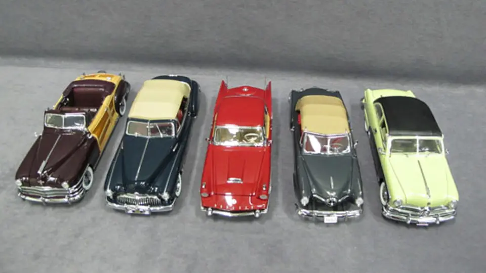 Five (5) 1/24 Scale Danbury Mint Cars - 1950 Ford Crestliner, 1950 Studebaker Champion Convertible, 1958 Packard Hawk, 1948 Buick Roadmaster Convertible, 1942 Chrysler Town & Country Convertible.