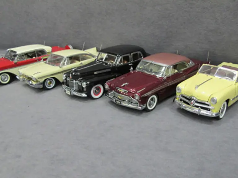 Five (5) 1/24 Scale Danbury Mint Cars - 1949 Ford Custom, 1956 Desoto Sportsman Coupe, 1941 Cadillac Fleetwood Series 60 Special, 1958 Plymouth Fury, 1957 Mercury Turnpike Cruiser.