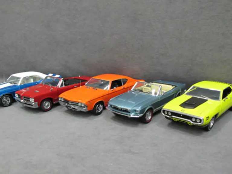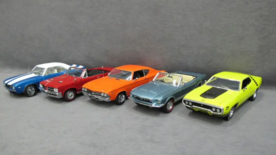 Five (5) 1/24 Scale Franklin Mint Cars - 1971 Plymouth Roadrunner New in Box, 1967 Ford Mustang New in Box, 1969 Chevrolet Chevelle SS 396 New in Box, 1964 Pontiac GTO New in Box, 1969 Chevrolet Camaro Z28 New in Box.