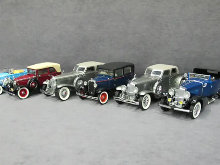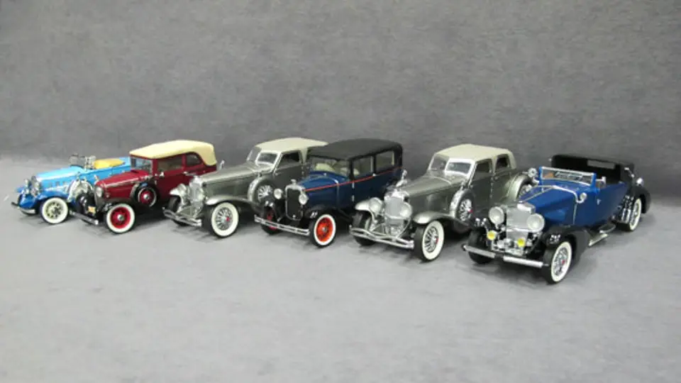 Six (6) 1/24 Scale Franklin Mint Cars - 1933 Duesnberg J Victoria New in Box, 1933 Duesenberg SJ Twenty Grand New in Box, 1930 Ford Model A Tudor New in Box, 1932 Ford Convertible Sedan Bonnie and Clyde Edition New in Box, 1932 Chevrolet Confederate New in Box.