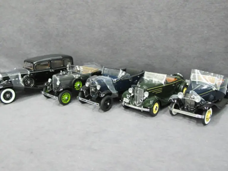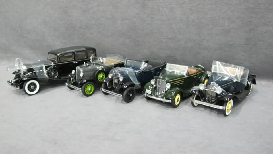 Five (5) 1/24 Scale Danbury Mint Cars - 1932 Ford Deluxe Roadster V-8 New in Box, 1935 Green Chevrolet Standard Sports Roadster New in Box, 1931 Ford Model A Phaeton New in Box, 1931 Ford Model A New in Box, 1932 Cadillac V-16 Sedan New in Box.