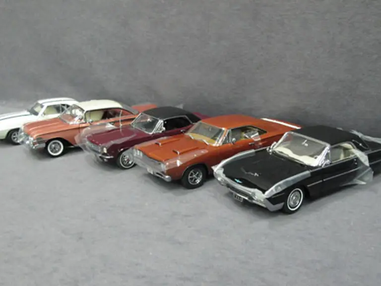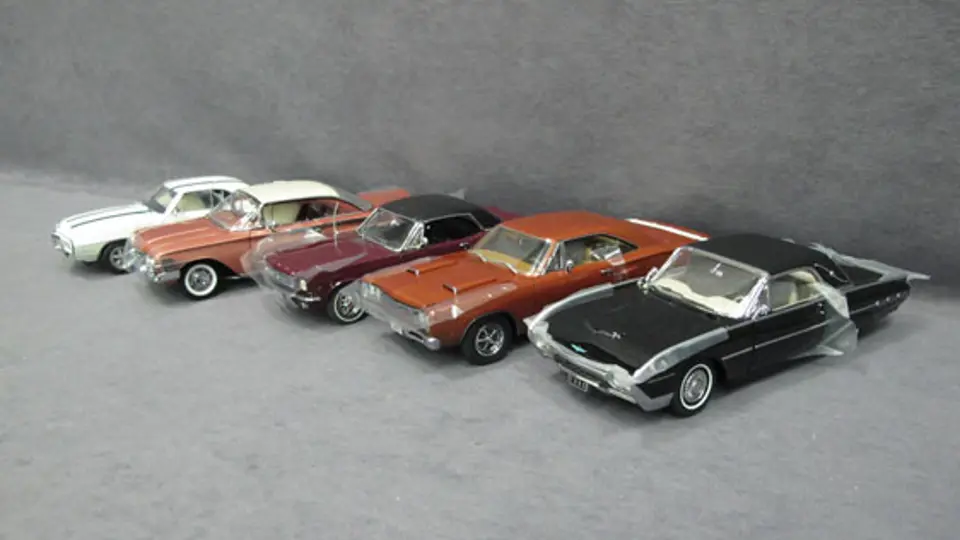 Five (5) 1/24 Scale Danbury Mint Cars - 1962 Ford Thunderbird Landau Coupe New in Box, 1969 Dodge Superbee New in Box, 1966 Ford Mustang Hardtop New in Box, 1960 Chevrolet Impala Sport Coupe New in Box, 1969 Pontiac Trans Am New in Box.